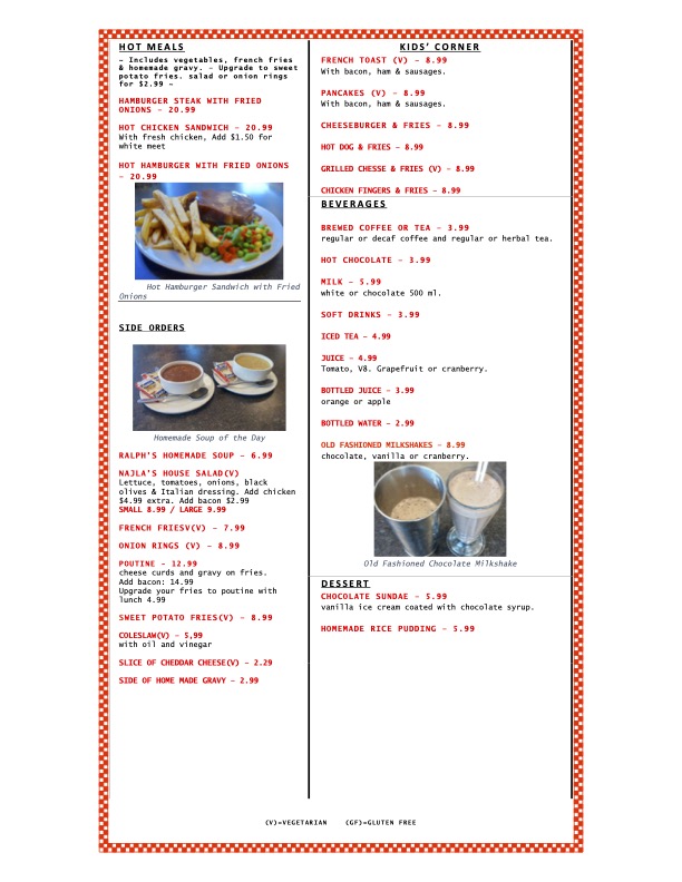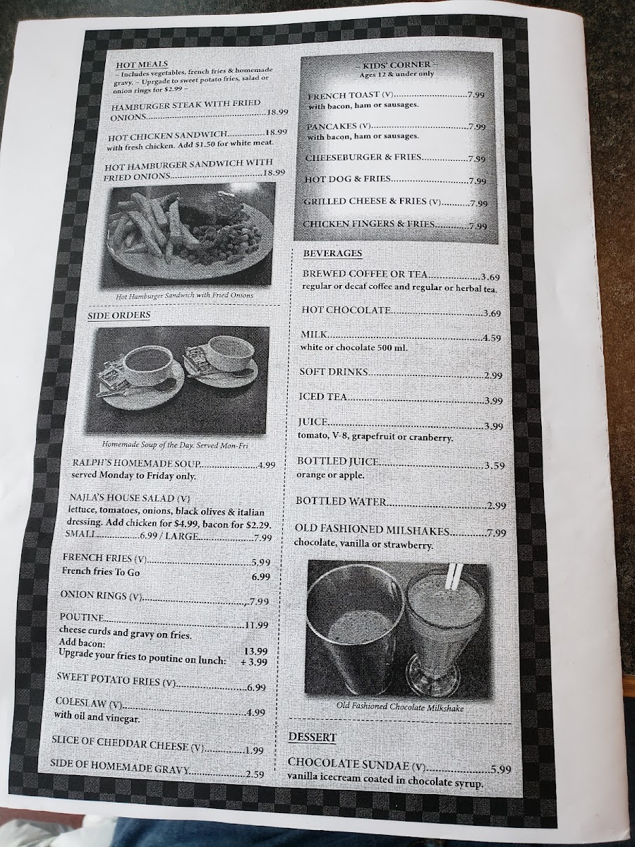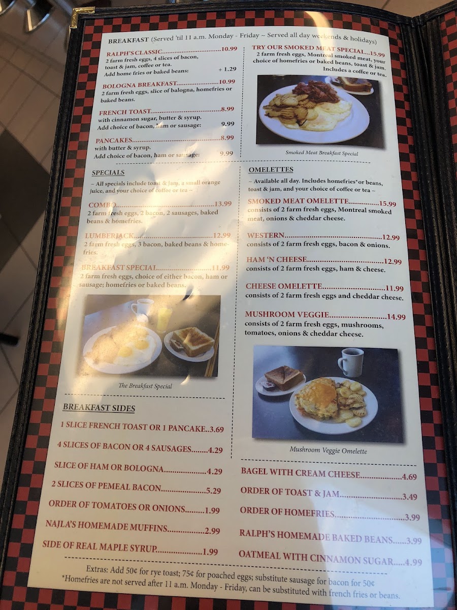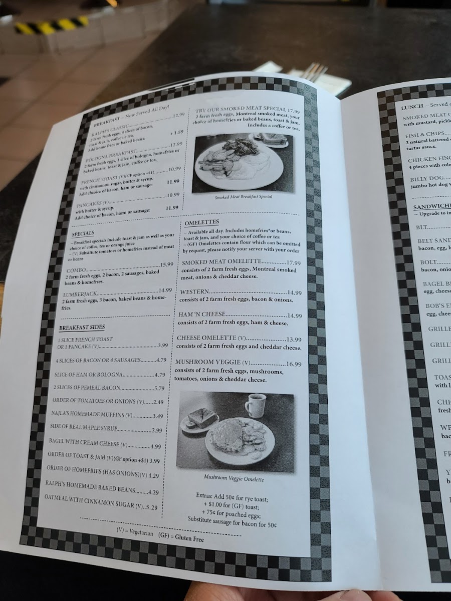 Welcome to Ralph & Sons Diner, a delightful family-run eatery located at 3420 Carling Ave in Nepean. This charming diner offers a menu brimming with hearty Canadian favorites, perfect for breakfast or lunch. Begin your day with their enticing breakfast sides like mouthwatering French toast or crispy bacon, tailor your meal with a Bagel Breakfast Sandwich, or indulge in classic options like the western omelet.
